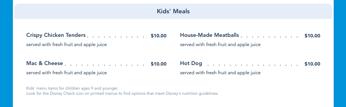 There are a few kids’ meals as well, with options like a hot dog or chicken tenders.