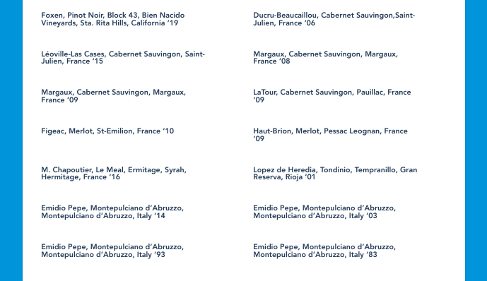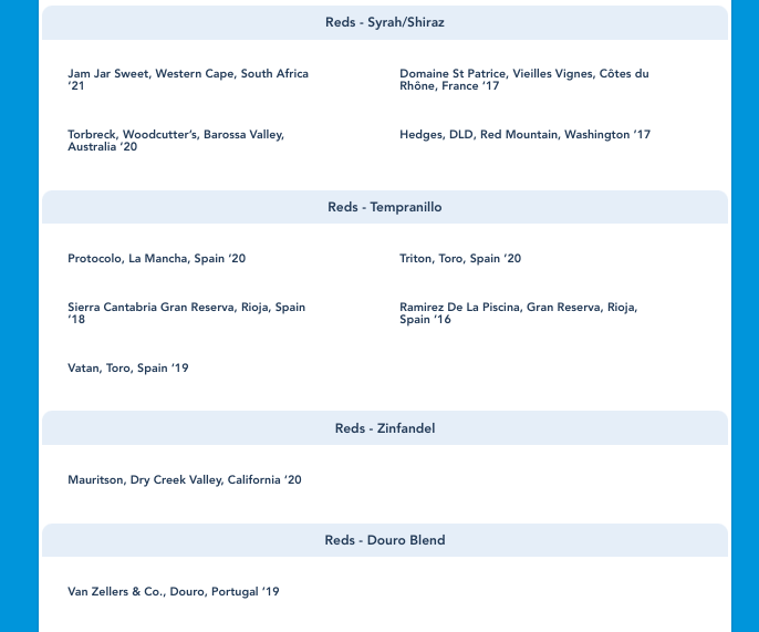 Then it moves into red wines by the glass, including lots of different sections for different kinds of red wine.