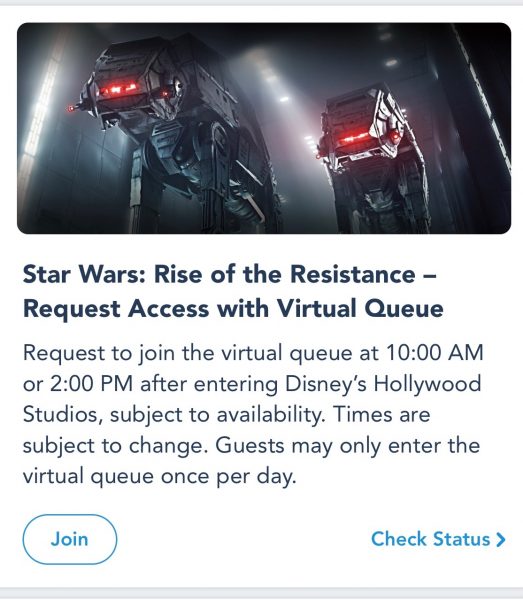 UPDATE: Since this post was originally written, the Rise of the Resistance Boarding Group process has changed quite a bit. Guests can currently grab a boarding group at 7AM and 1PM. To try for a pass at 7AM, guests no longer have to be in Disney’s Hollywood Studios. You can grab a pass from anywhere as long as you and your party have a Park Pass Reservation for Hollywood Studios. For the 1PM slot, guests must be in the park to get a pass.