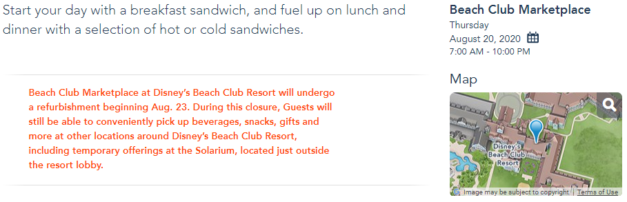 According to the Beach Club Marketplace page on the Disney World website, the refurbishment will begin on the quick-service spot in just three days on August 23rd. The length of the closure is not currently announced but Beach Club Marketplace is listed with “No Times Available” through the end of the calendar (February 16th).