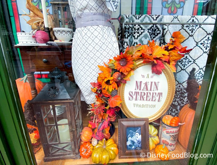 We were strolling down Main Street, U.S.A. today, and were feeling all the autumn feels when we spotted the shop windows were full of fall foliage!
