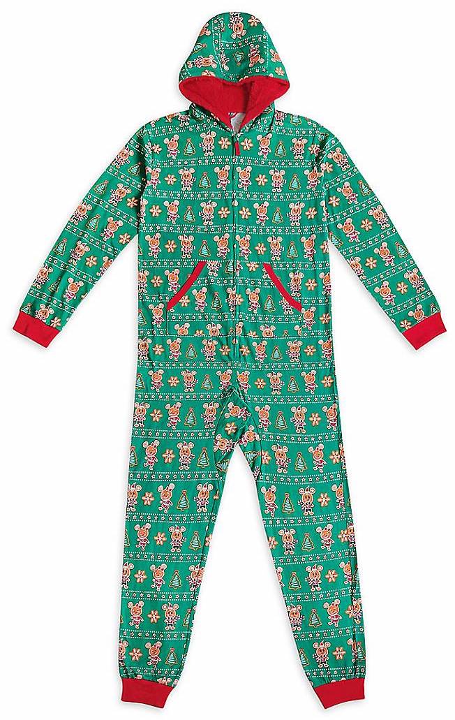 The one-piece Mickey and Minnie Mouse Holiday Bodysuit for Men rounds out our holiday outfits for the human members of the family. It’s got a fun hood with a red interior lining and even pockets!