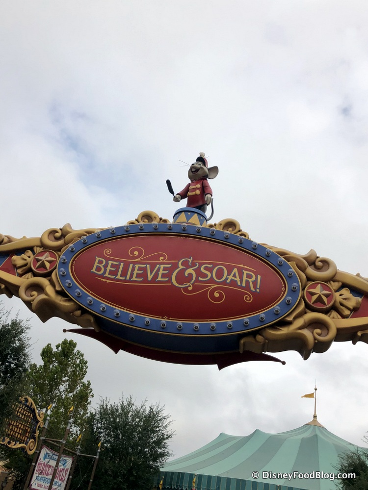 You might remember the iconic Timothy Mouse on the central hub of the ride, but you won’t spot that little guy in the center of either current iteration of the ride. Instead, you’ll see a new central hub with artwork panels from Dumbo. You CAN however spot Timothy over at the attraction’s sign.