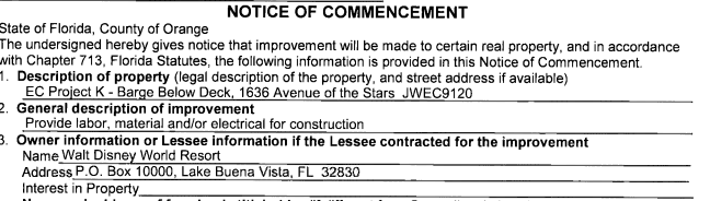 First up, we saw a permit for the address that’s coded to the Marina Entertainment space that helps to house the nighttime spectaculars that take place on World Showcase Lagoon. The permit description is vague and it’s filed with Disney’s internal construction company — but there IS something interesting about this info!