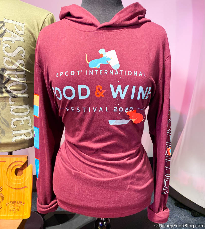 Does your wardrobe need a refresh? There are tops a-plenty at the Food and Wine Festival! If you’re looking for that “classic” Food and Wine Festival shirt, look no further than this cute maroon hoodie!