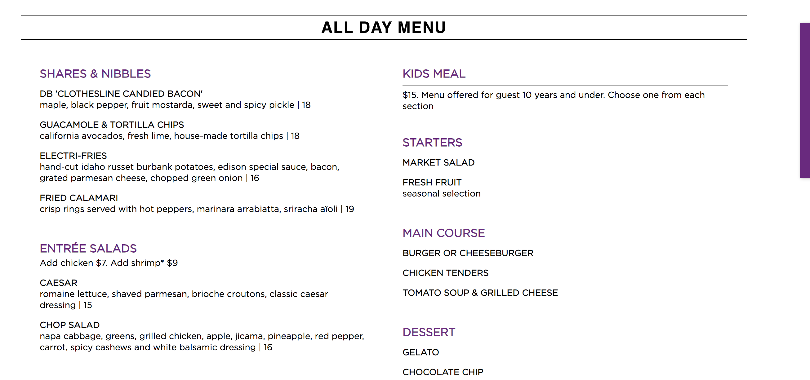 As we noted before, some big cuts were made to the menu. You can currently view the old menu on disneyworld.com. The new menu is on posted the restaurant’s website and is significantly smaller. Most notably, the deviled eggs and Edison Wings are missing from the appetizers while three of the five salads were missing.