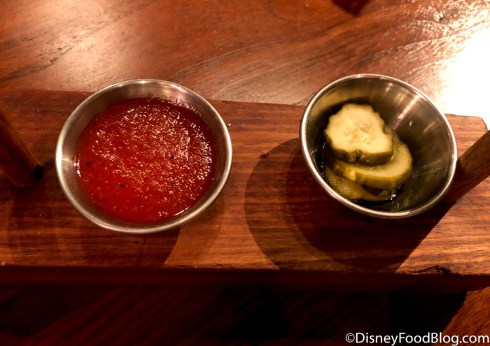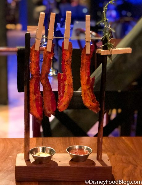 The limited menu is displayed outside the restaurant and accessible from the restaurant’s website. Appetizers and entrees have been cut way back, like many other Disney restaurants. Limited menus are put in place to assist the reduced and/or social distancing kitchen staff as well as potential production shortages. And for now, the famous DB ‘Clothesline Candied Bacon’ beckoned us to venture inside.