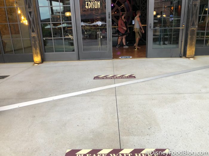 The check-in line had plexiglass barriers in place. These have been implemented all over Disney World to create a protective barrier between guests and employees. We visited The Edison the day after it opened on a Friday night. Even with limited capacity, the restaurant was considerably empty. Usually, the entertainment draws large weekend crowds. We didn’t have to wait long to get checked-in. Again, this may change as things ramp up!