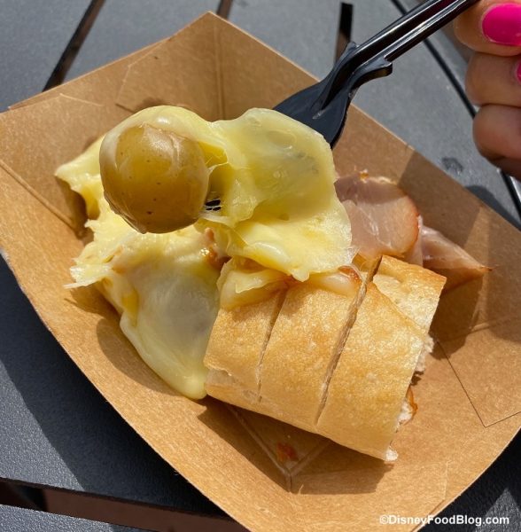 Plus, the pickles and potatoes pack some extra flavor and texture with each bite, along with the baguette for dipping! Although it’s more like a fondue or mini charcuterie, the Warm Raclette Swiss Cheese is definitely big enough to sub out for your lunch or dinner in the parks.