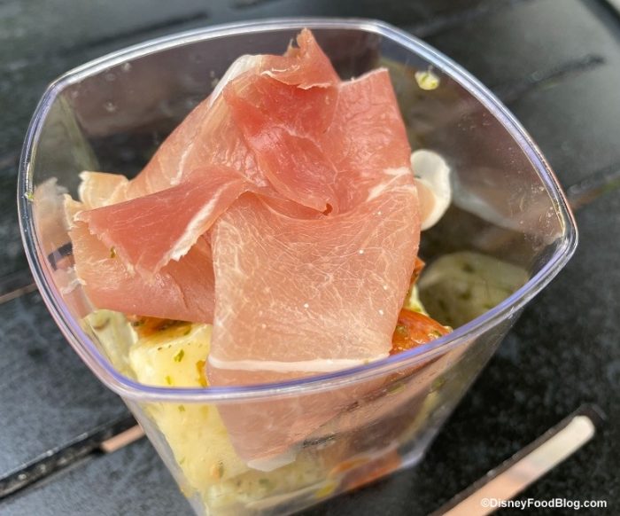 Although this cup may not look like much, we were SHOCKED by how filling and flavorful the Charcuterie was! There’s a lot more food inside than we expected, which packed so many wonderful flavors. The manchego is a harder cheese that has a great nutty taste compared to the saltiness of the meats.