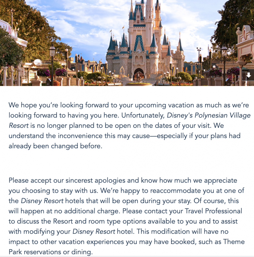 In the case of the Polynesian specifically, Guests are already being contacted by Disney with options moving forward. According to a letter received from reader Kristel B., Guests may choose a new resort “at no additional charge.” Switching to a new resort also will not impact other vacation experiences, including Park Pass Reservations.