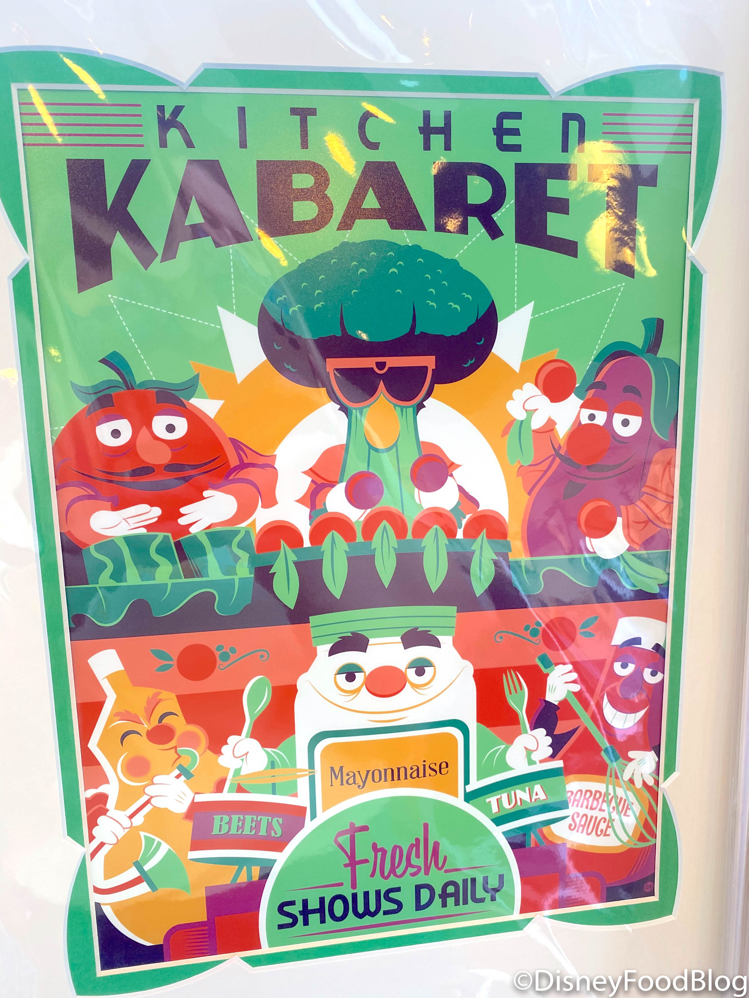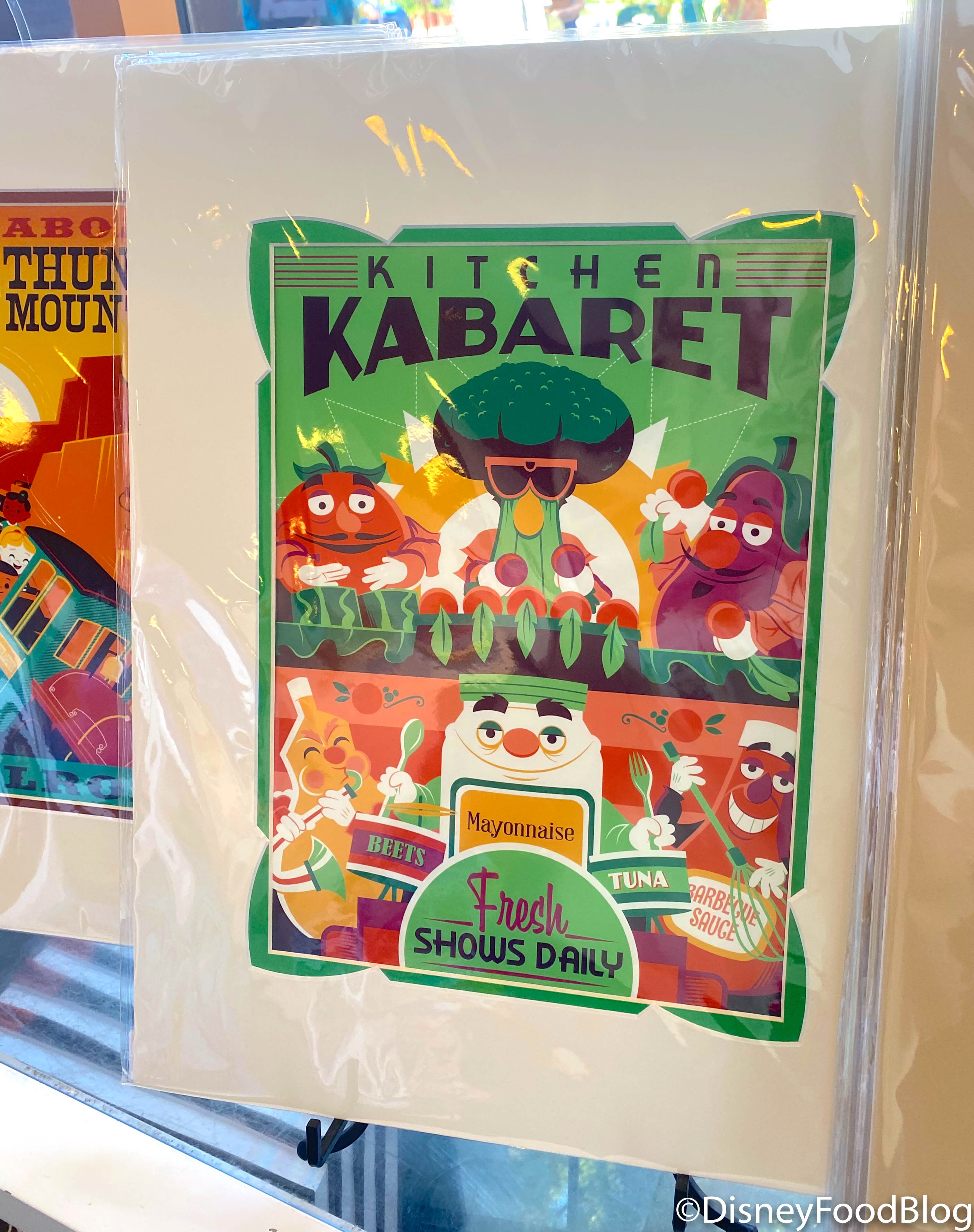 We spotted some adorable posters showcasing attractions like Big Thunder Mountain and the Country Bear Jamboree in the WonderGround Gallery. The Kitchen Kabaret Poster caught our eye with produce and condiments jamming out during their “fresh shows daily.” And, it REALLY made us miss the long-lost show in the parks!