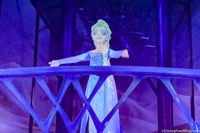 During the Let It Go scene of the ride, Elsa works her magic and guests go soaring backward down the river. Yesterday, Elsa could hardly be bothered with all the silly magic stuff. Her eyes were about half-closed while she sleepily waves her hands to get those pesky guests out of her castle.
