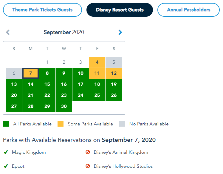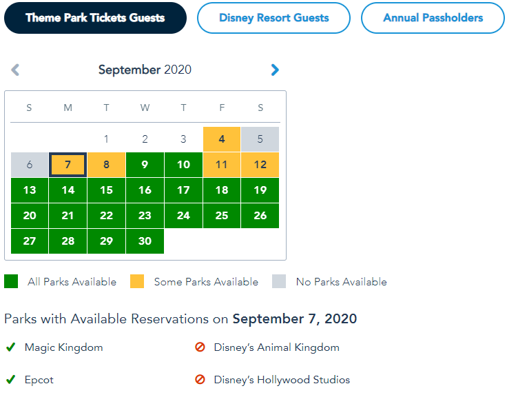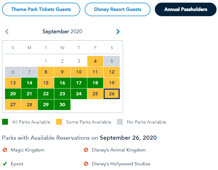 Of course, the Annual Passholder calendar looks different with September 5th through 7th completely booked. The majority of days for the rest of the month have also run out of availability in at least one park, with the weekends being the most booked.