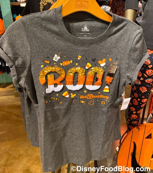 And we also saw this sparkly “Boo” Halloween T-Shirt with multi-colored sequins and sweet treats for $39.99.