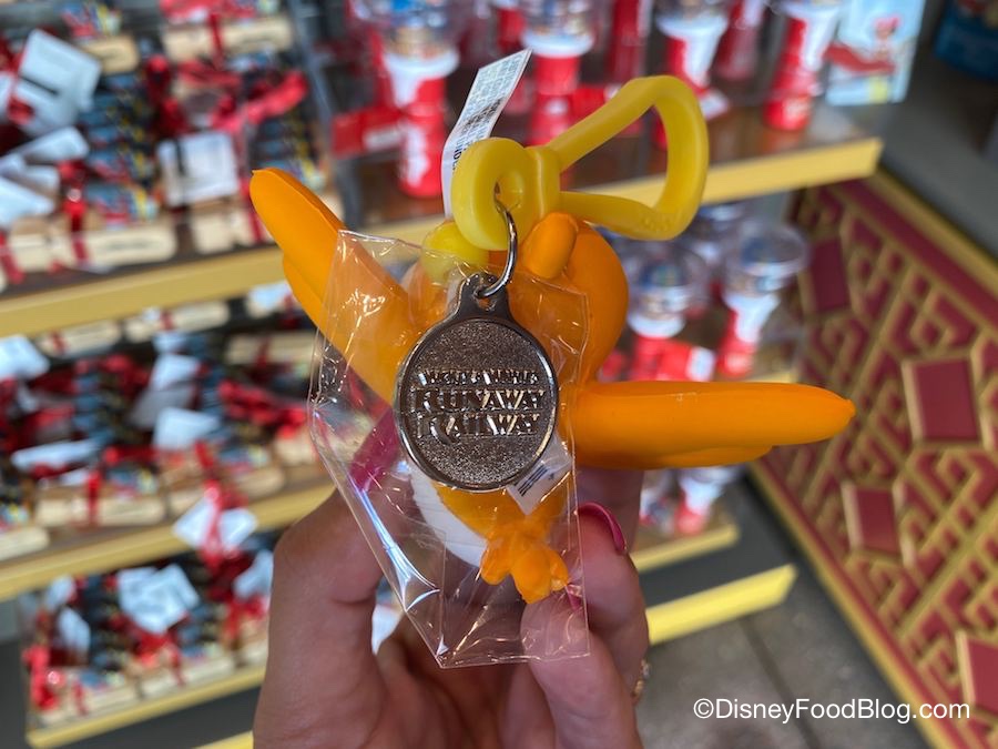 He’s attached to a bright yellow clasp, and a metal token that says “Mickey & Minnie’s Runaway Railway.”