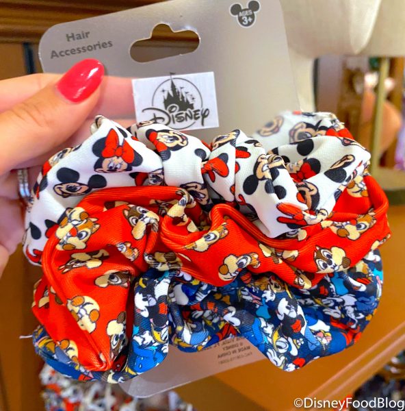 Also at the Emporium, you can use the Fab Five Scrunchies when you get ready for your day in the parks! The pack comes with three scrunchies featuring Minnie, Chip and Dale, and the rest of the gang for $11.99.