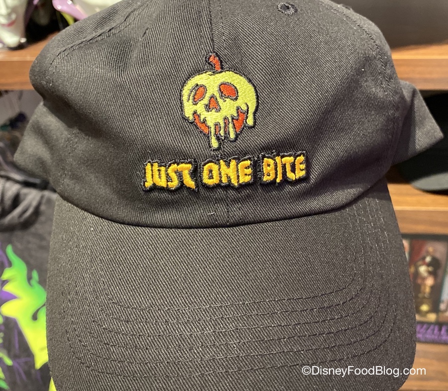 A nod to the Evil Queen’s trickery to get Snow White to take a bite, the cap features an apple dripping with green poison, over the yellow words “Just One Bite.”