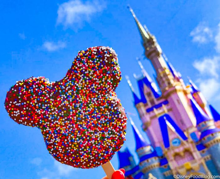 Once you get closer you can clearly see some of our favorite Disney pals, like Mickey and Minnie, posing in the pattern. But where are the treats!? Look closer! The pattern features a BUNCH of treats like Mickey Bars and Minnie Mouse ice cream cones.