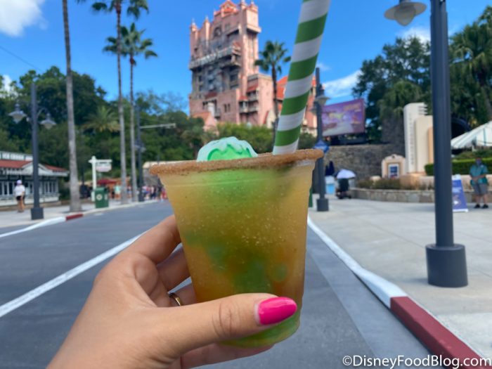 So far, we hacked into Constance’s For Better or For Worse Wedding Cake, took a ride with the Headless Horseman Float, and had a monstrous Mickey Monster Mash Burger. Think we’re full yet? Guess again! While seeking out some sinister snacks at Disney’s Hollywood Studios, we decided to get the Frozen Apple Cider to wash it all down. Here’s what we thought of this spooky concoction!
