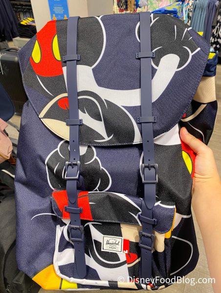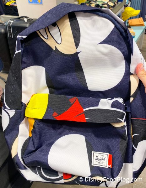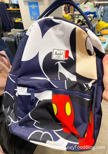 The hip pack is available at Curl Surf for $50.95. If you’re familiar with the Herschel brand, you’ll know that they’re definitely known best for their backpacks! So this collection has a fair amount of them available. In addition to the mini-backpack above, we saw two medium-sized backpacks! The first is your standard backpack (with, of course, this too-cool-for-school Mickey Mouse design).