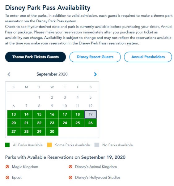 We did a search of park pass availability on the Disney World website and looked at next weekend — and we saw that there isn’t a single park pass available for any of the four parks on Saturday, September 19th.