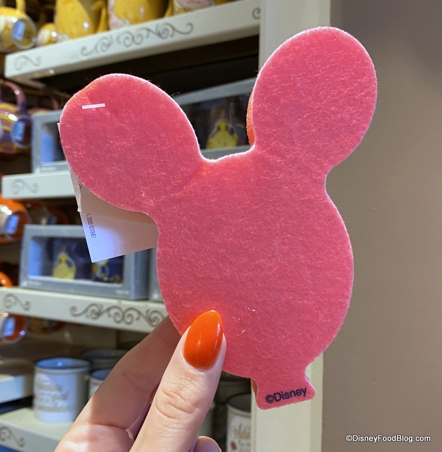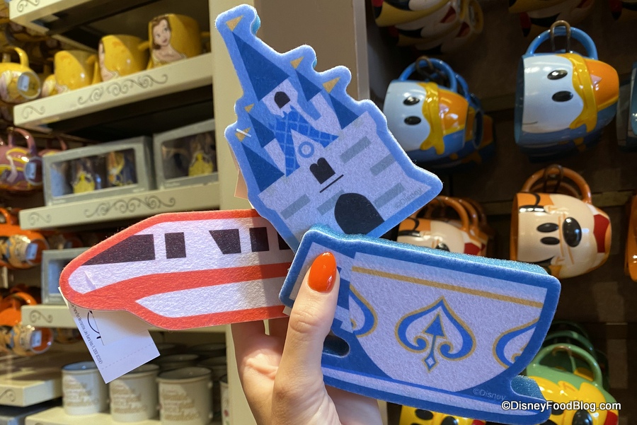But we think we found a little something — or make that “somethings” — that might give you a reason to look forward to the chore at least a little bit. On our stop by Magic Kingdom’s Emporium today, we found a collection of kitchen sponges designed like park icons to help you “Whistle While You Work!”