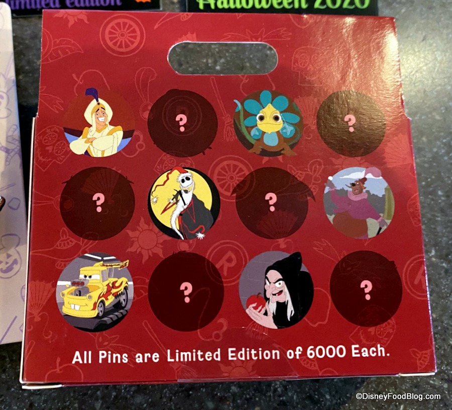 The other boxed pins feature Little John (!!), Jack Skellington (he’s here today, too!), and the transformed Evil Queen (ready with her Poisoned Apple) among the selection. Of course, you may end up with a mystery pin from the bunch!