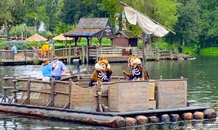Over in Frontierland, Chip & Dale are looking SO cute in their skeleton costumes as they float by on a raft.
