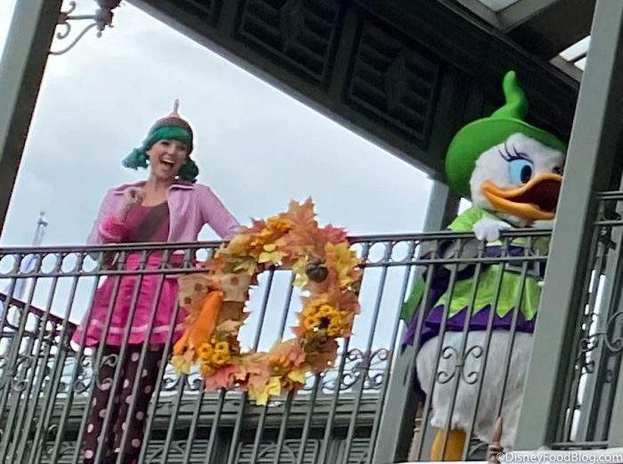 Daisy is wearing a very fashionable witch outfit. And, get this, Mickey and Friends are accompanied by Cast Members in costume from the Boo to You Parade that usually runs during Mickey’s Not-So-Scary Halloween Party! That’s Sugar Rush Racer Candlehead who usually accompanies the Vanellope float!