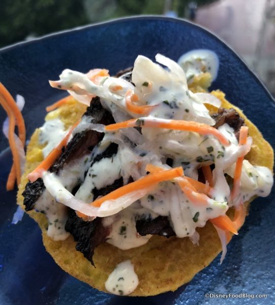 This booth originally opened in 2017 and is home to some of our favorite Food and Wine Festival eats! The Smoked Corned Beef with Warm Crispy Potatoes, Pickled Onions, and Blonde Ale Beer Fondue is consistently one of our top picks at the WHOLE festival. We can’t resist all those flavors together, and we even tell people who don’t like corned beef to get it anyway because BEER CHEESE and thick crunchy chips! This is one of those foods we not-so-secretly wish was available in a straight-up BUCKET. It’s…that…good.