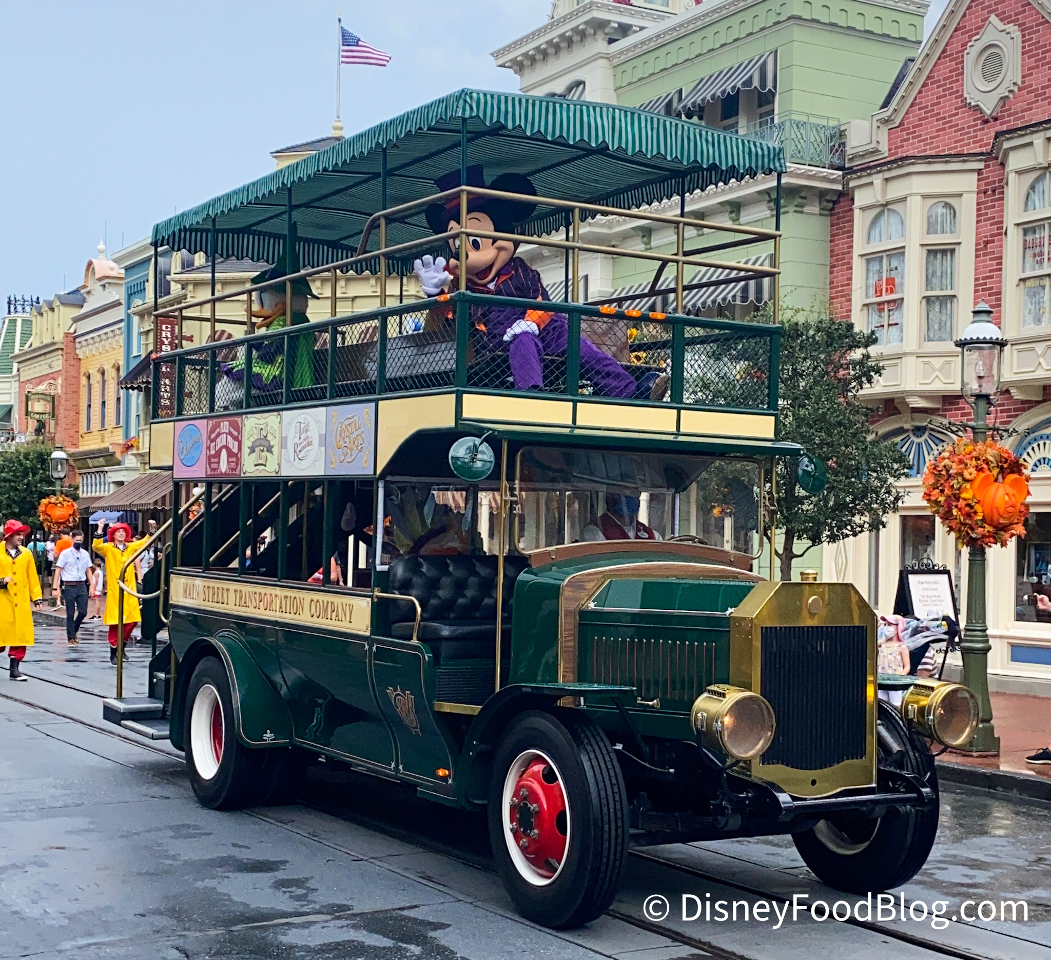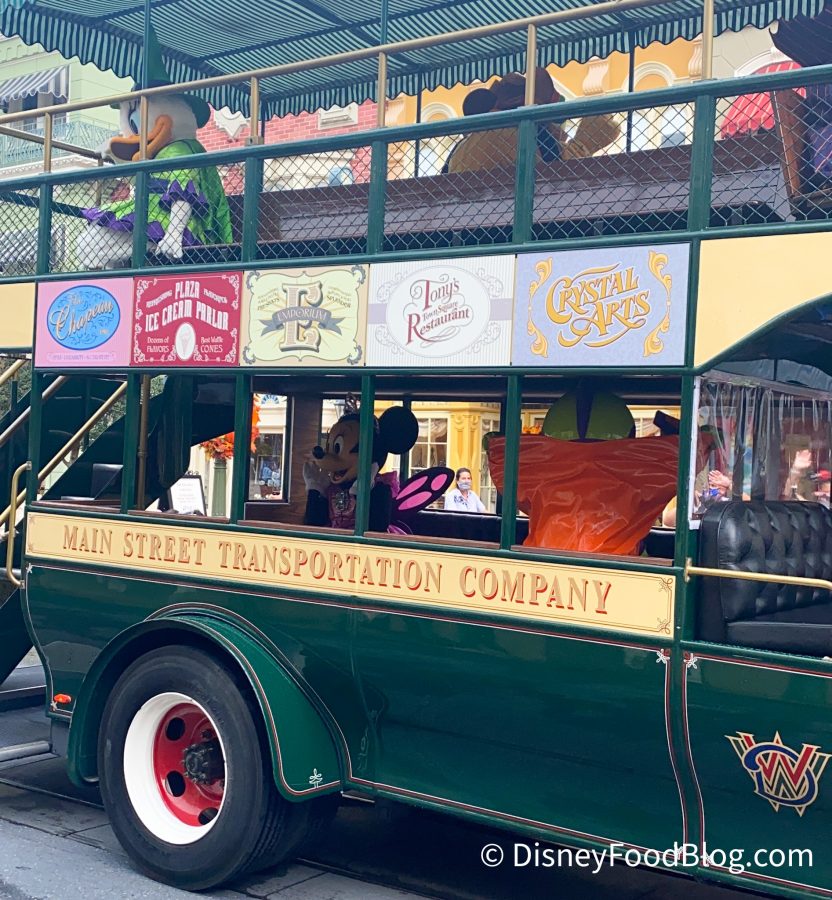 Mickey can be spotted sitting up at the front of the bus waving to guests in his adorable vampire costume!