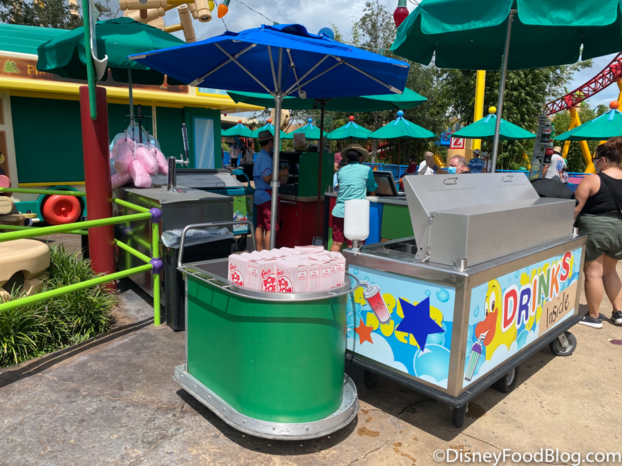 Toy Story Land is home to only a few food options. While we wait for Woody’s Lunch Box to reopen, we frequently stop by the snack carts to see what kind of grub we can muster up. Yesterday, we saw that the snack cart is selling popcorn and cotton candy again!