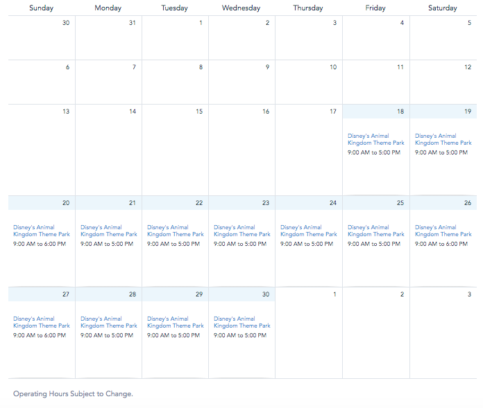 Since September 8th, the operating hours at Disney’s Animal Kingdom have regularly been 9AM-5PM. However, Disney has extended the hours on a few days to give guests some extra time in the park. So far, we’ve seen the Animal Kingdom operating hours on Sunday, September 20th and Saturday, September 26th extended to 9AM-6PM.