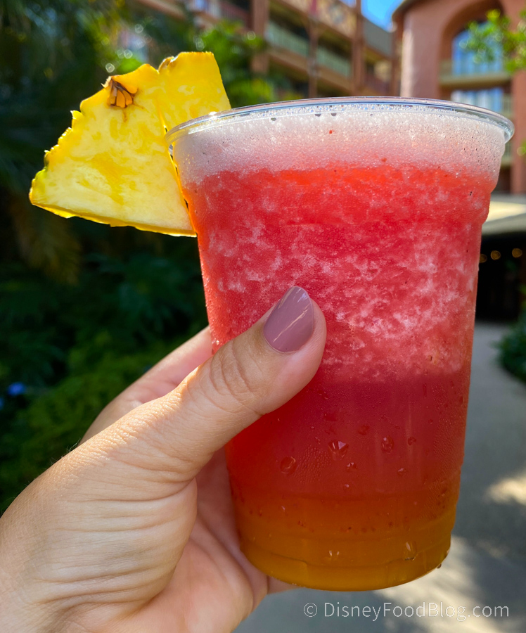 A Cast Member also told us you can request a virgin version of the drink for kids, too! They ring it up as a virgin strawberry daiquiri, so you have to make sure to ask for strawberry and mango to get the same flavors as the African Sunset.