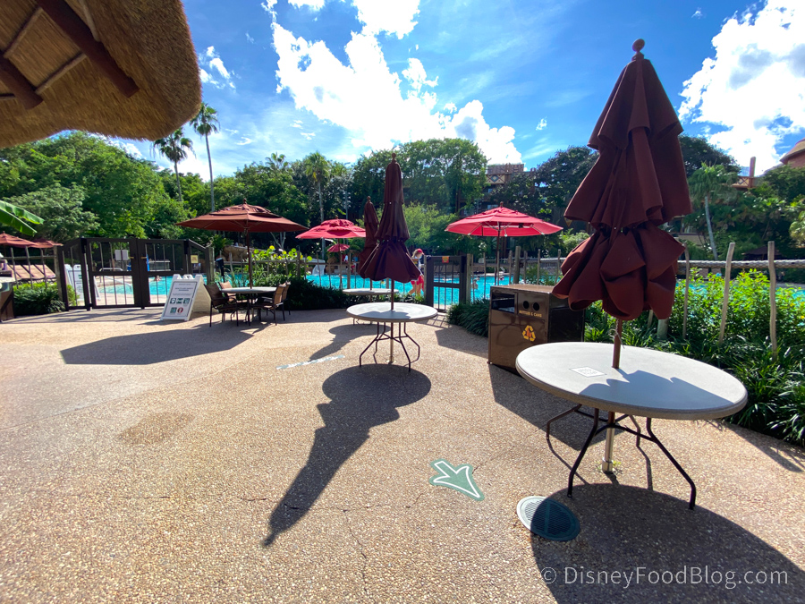 The pool bar reopened on Labor Day, but it’s only open on weekends, Friday through Sunday. As you can see, tables are spread out, and there are markers on the ground for social distancing.