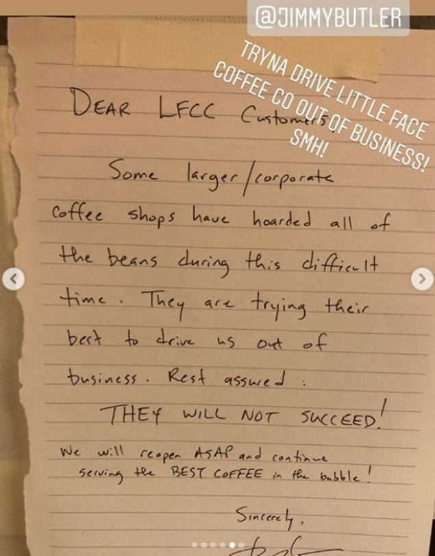However, Butler just got some new competition, according to the NBA Bubble Watch on Instagram. The Miami Heat’s assistant athletic trainer, Brandon Gilliam, has now opened his own coffee shop! Not only does he promise a more customer-friendly approach, but he also offers free samples and only charges $5 per cup. And he named his shop Little Face Coffee. LOL.