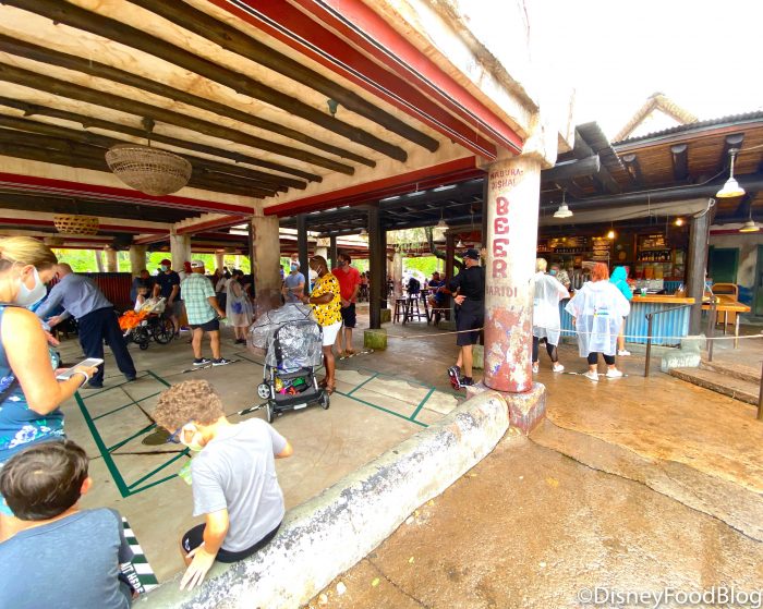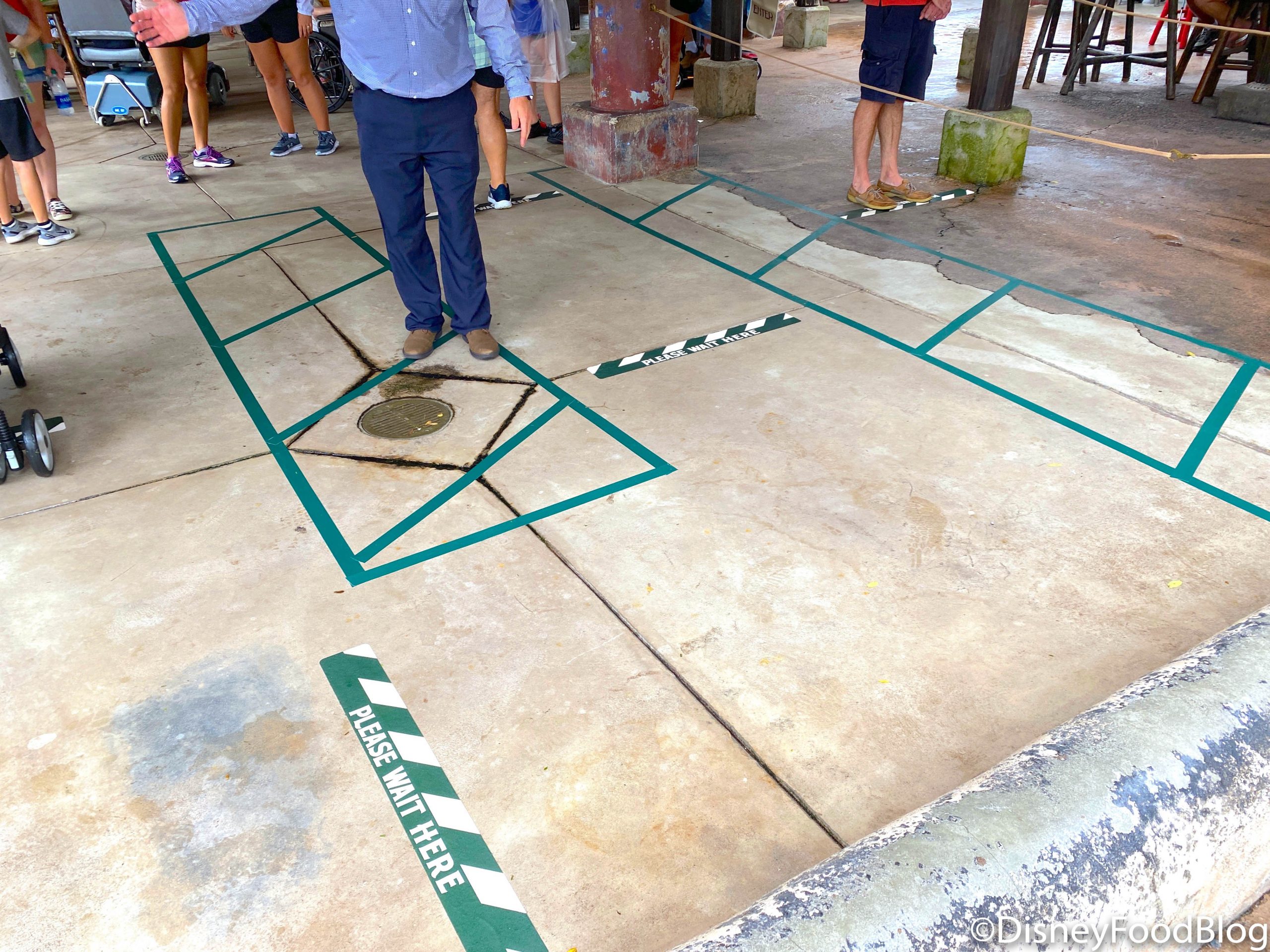 The line for Dawa Bar has distancing markers to indicate where guests should stand, and there are taped-off areas to show the empty space that should be left between line switch-backs. There was also a Cast Member managing the line.