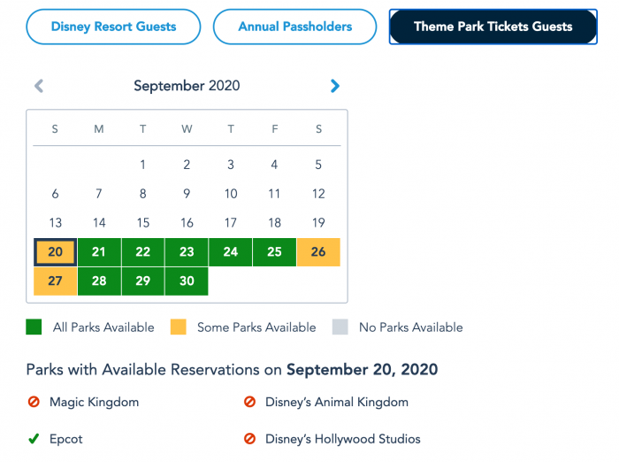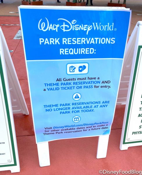 This is helpful for guests who don’t have a ticket yet, basically letting them know there’s no reason to purchase one for today. BUT — always check the availability calendar online before trusting this signage. At press time, checking the calendar, we saw that EPCOT still had availability today for regular ticket holders and resort guests. So cancellations are always happening and you may be able to snag a park pass at the last minute. Or perhaps Disney is putting out this sign knowing that EPCOT availability will sell out today at some point.