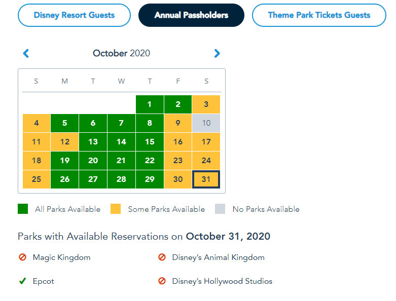 Disney’s Animal Kingdom shows no availability for Annual Passholders on October 31st as of press time. EPCOT is the only remaining park available for Passholders to book for Halloween.