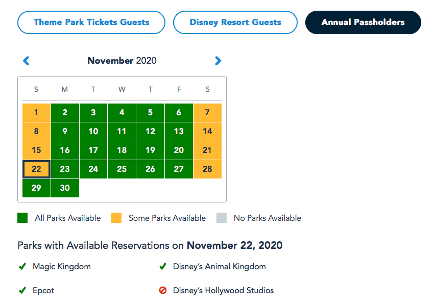 On November 22nd and 28th, however, Park Passes for Hollywood Studios for Annual Passholders appear to be currently unavailable.
