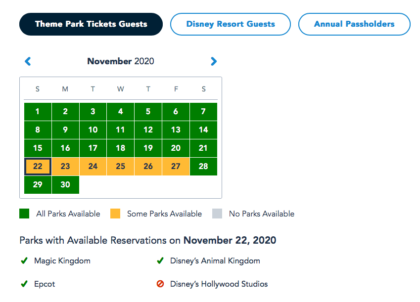 In fact, Park Pass reservations for Disney’s Hollywood Studios appear to be currently unavailable from November 22nd through November 27th for Theme Park Tickets Guests and Disney Resort Guests.