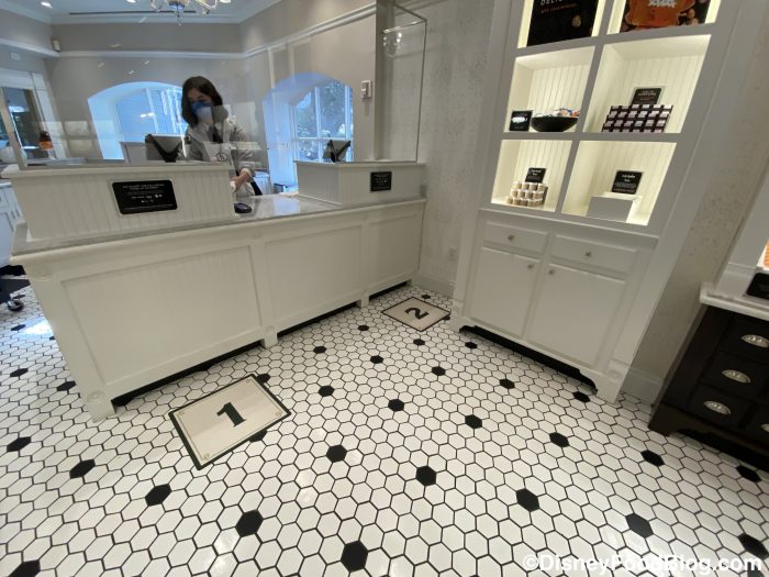 The store has markers for guests to stand on at the checkout counter and a plexiglass barrier between guests and the Cast Member.