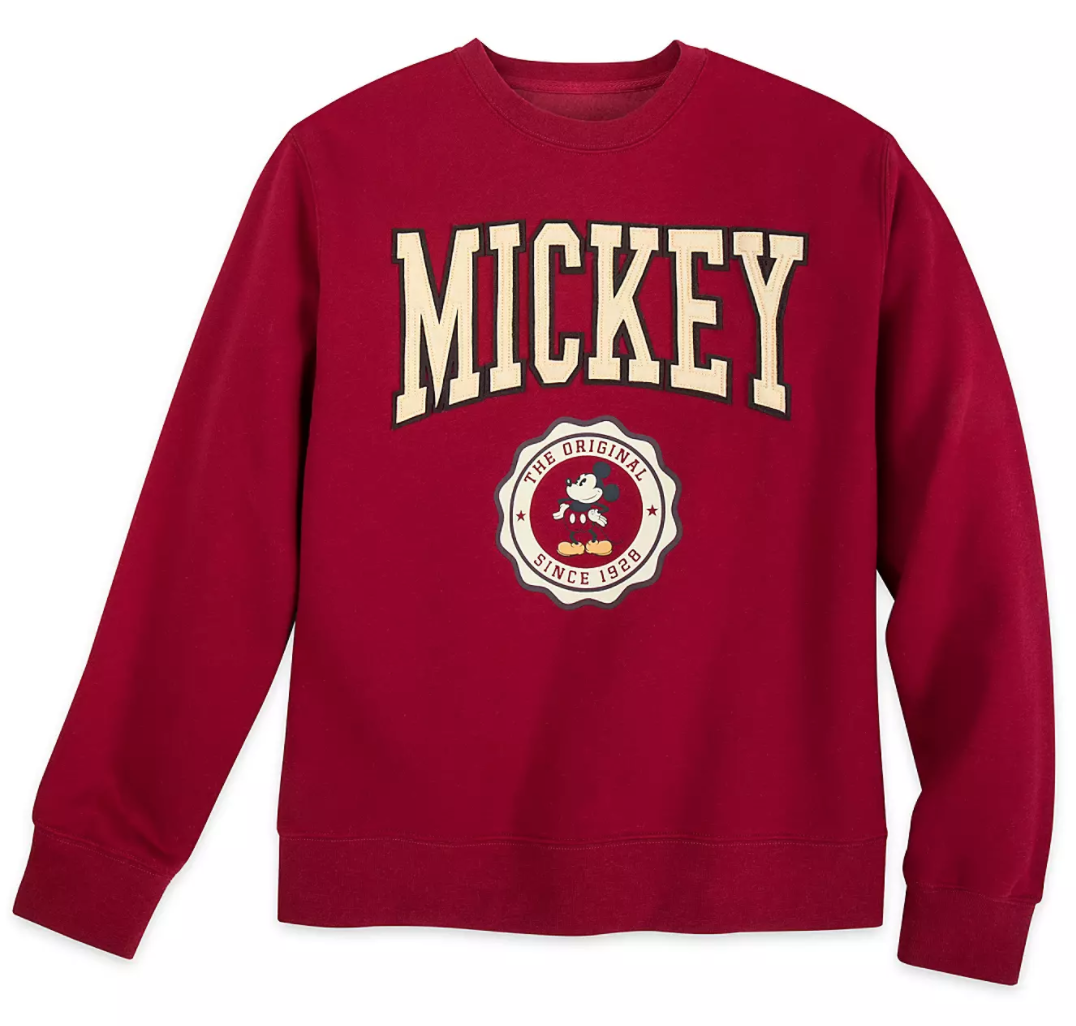 Next up is a sweatshirt sure to become a favorite! College styling on a pullover crew-neck sweatshirt reads MICKEY across the front with a small seal featuring everyone’s favorite Mouse, Mickey himself with “The Original Since 1928” inside the medallion.