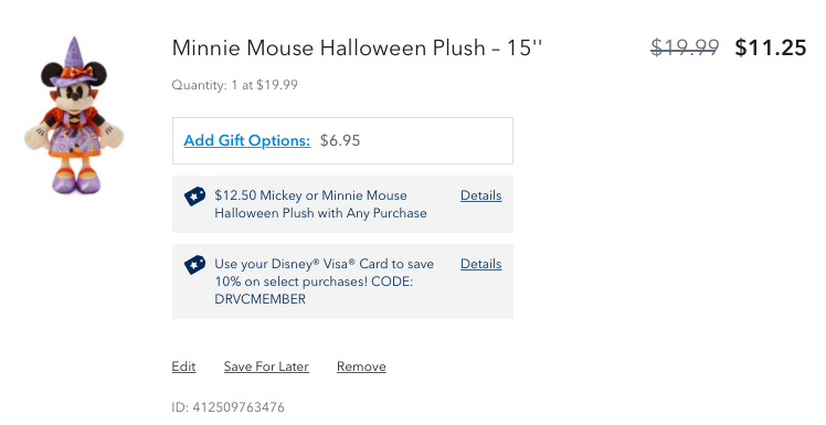 While you can buy these on their own for $19.99 each, right now you can get them for $12.50 each with any purchase. So, all you need to do is add the Mickey or Minnie Halloween plush you’d like to buy to your shopping bag with at least one other item you’ll be purchasing from shopDisney and ta-da! You’ll see the price of the plush “magically” reduce to $12.50 each. From what we saw, you’ll need to add at least one other item that is NOT the Mickey or Minnie Halloween plush to your bag to take advantage of this deal. When we simply added one of each plush to our bag with nothing else, they did not reduce in price.