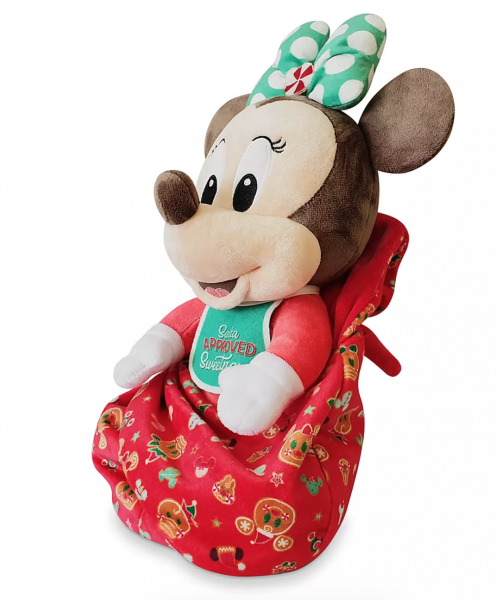 Baby Minnie wears a little bib that says: “Santa Approved Sweetheart,” and her blanket is decorated with gingerbread cookies and holiday Mickey ears.