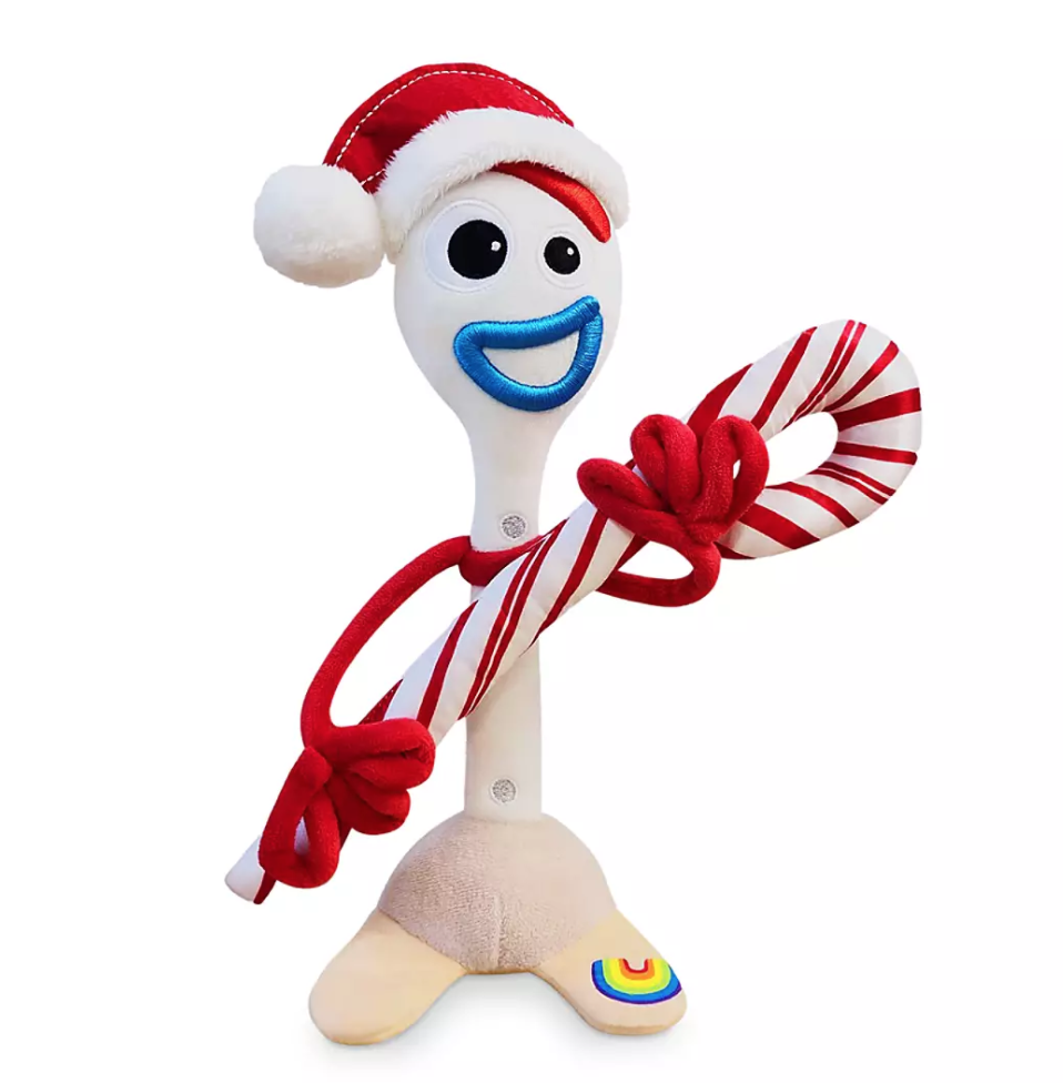 Stitch is a tough act to follow, so who better than everyone’s favorite TOY, Forky! He’s decked out in a Santa hat and comes bearing gifts in the form of a plush candy cane.