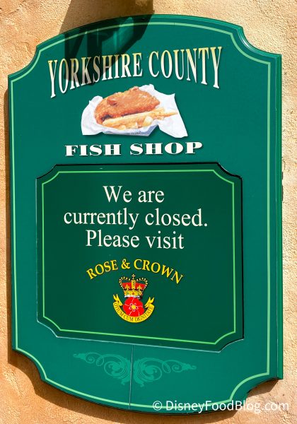 Good news!! While Yorkshire County Fish Shop in the U.K. Pavilion was closed when we visited. It will finally be reopening. But at this time, it will only be open on the weekends.
