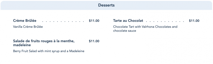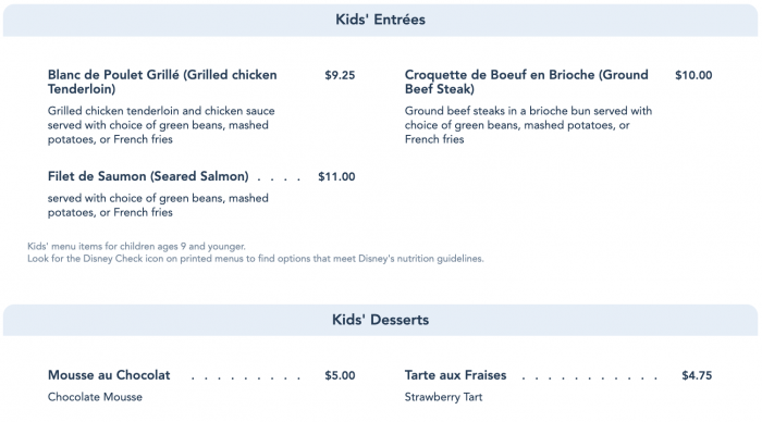 The Kids’ Menu has also changed slightly ahead of Chefs de France’s reopening. The Pâtes au Jambon et Fromage (Pasta with Ham) was removed from the Kids’ Entree selections, and the Dessert menu was updated by REMOVING Choix de Glace ou Sorbert (Ice Cream or Sorbet), Biscuit au Chocolat (Chocolate Chip Cookie), and Yaourt aux Fruits Rouge (Lowfat Yogurt) and ADDING Mousse au Chocolate (Chocolate Mousse) and Tarte aux Fraises (Strawberry Tart).