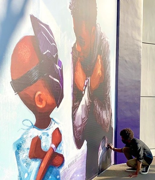 The inscription on the mural reads, “As a former Disney Imagineer, I had the honor of working on a major children’s hospital initiative and Avengers Campus as my final two assignments. Seeing Chadwick’s heart for people in-person, and later discovering his courageous battle with cancer, I was inspired to create this tribute to honor his life and legacy. To us, he was and will always be T’Challa. Long Live The King.”